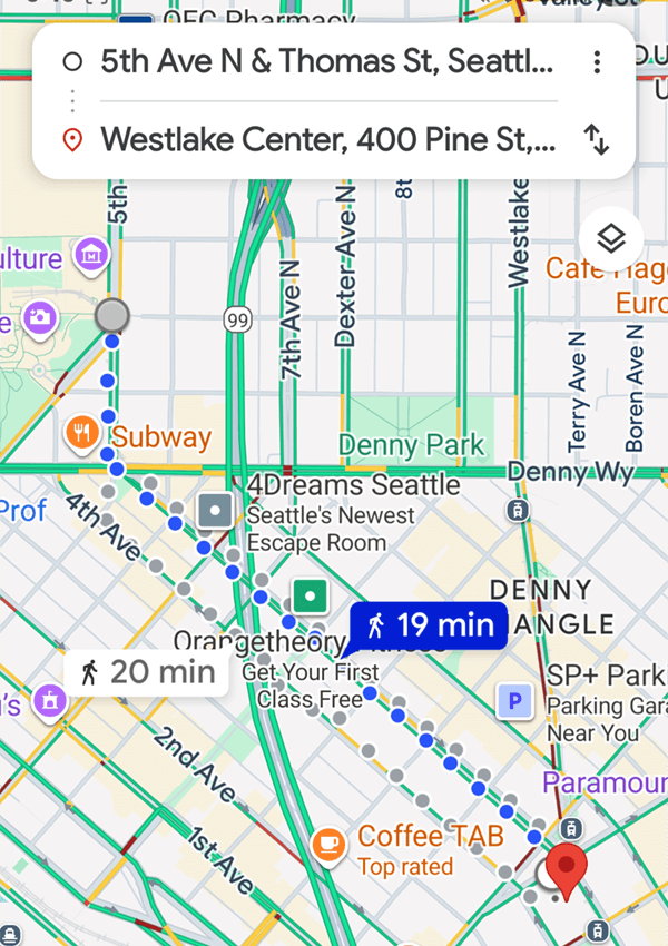 Start at 5th Ave. N & Thomas at 11, and proceed on the sidewalks, for safety and public space utilization, and complete the 0.08 walk to Westlake Center